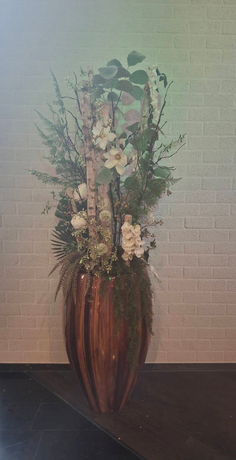 Deze zomer heb ik mogen werken aan een hele bijzondere opdracht voor het crematorium in Venlo. Zij hebben mij beaderd met de vraag of ik voor bij hun in de aula 2 grote kunstbloemstukken wilde maken. Natuurlijk wilde ik dit doen! Wat een eer om mijn creativiteit in te zetten en een betekenisvolle bijdrage te leveren. Het eindresultaat is prachtig en hier ben ik ontzettend trots op. Ik heb 2 indentieke arrangementen gemaakt op basis van echt berkenhout, omringt door vele soorten luxe kunstgroen en elegante witte kunstbloemen. Ik ben enorm trots op hoe deze bloemkunstwerken een serene sfeer creëren en bijdragen aan elk afscheid wat plaatsvindt in het crematorium Venlo.